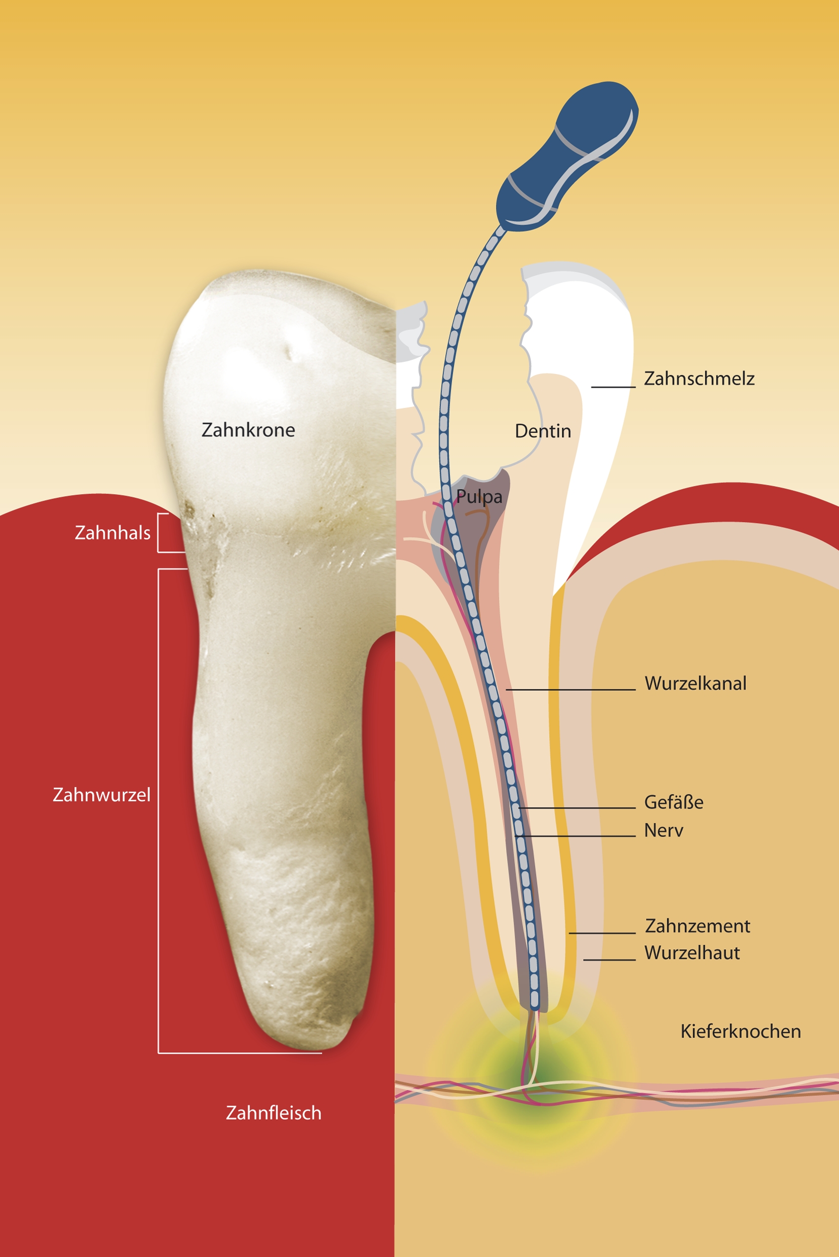 Die Wurzelbehandlung (Endodontie) ermöglicht es der modernen Zahnmedizin, auch einen bis in die Wurzel entzündeten Zahn zu retten, anstatt ihn ziehen zu lassen.